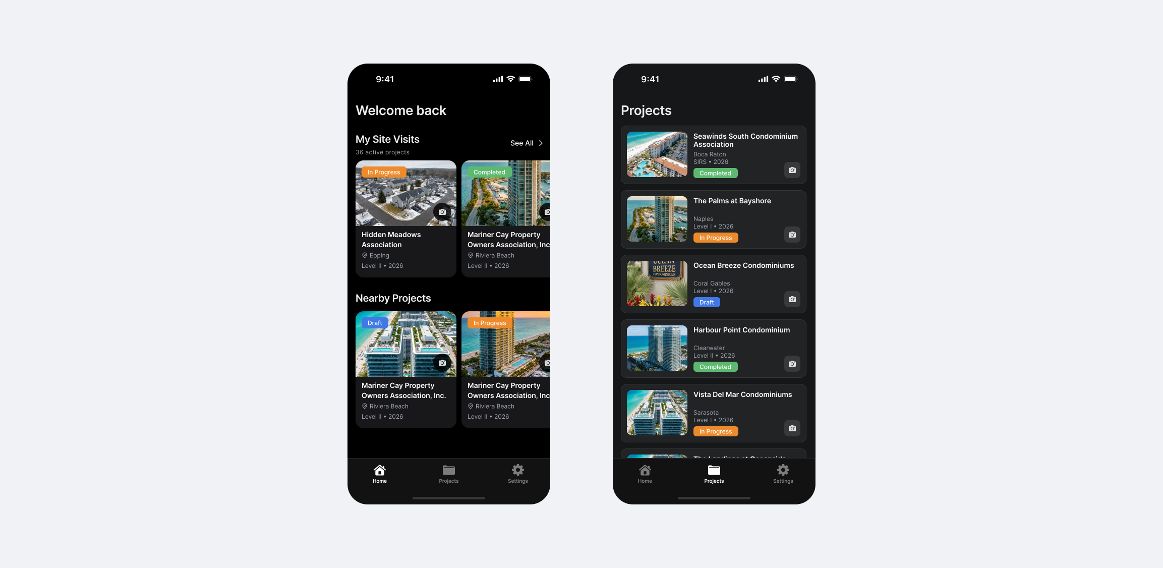 Your homescreen shows all upcoming site visits with status indicators—what's in progress, what's completed. If you're already near a property, the app surfaces projects within 50 miles of your current location.