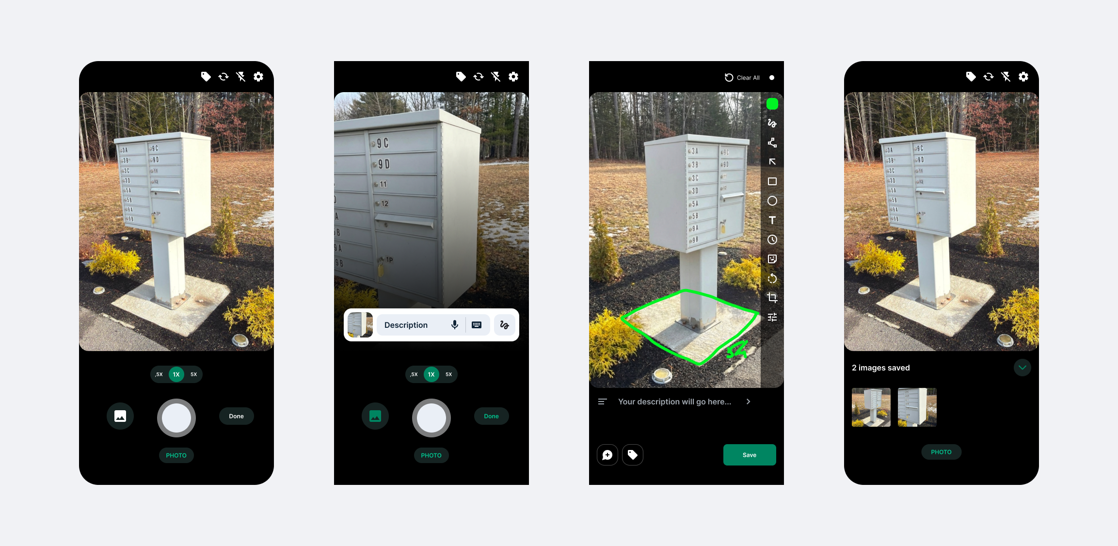 Sketch it. Draw directly on the image. Mark measurements, circle problem areas, add arrows. The tools are there when you need them.
